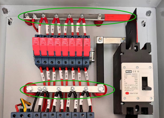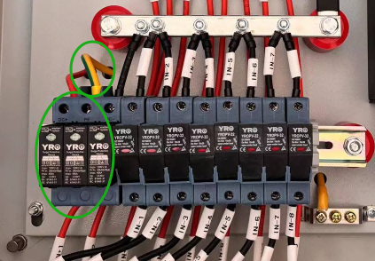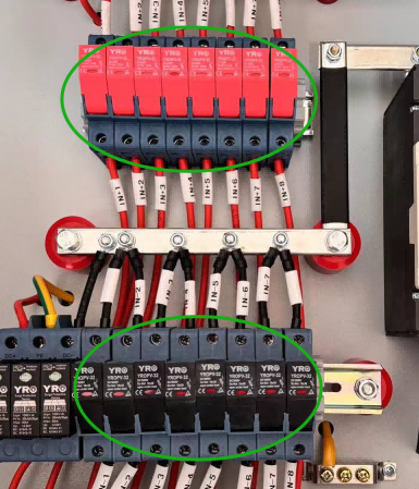 Seguindo em frente, montado ao lado do fusível preto é oRaio de raio. Sua principal função é impedir que o equipamento elétrico seja danificado por sobretensões transitórias (surtos). Durante a operação do equipamento, se você perceber que o indicador acende oRaio de raioTorna vermelho, significa que sofreu um forte choque de onda, como um raio ou auto -proteção devido a uma corrente anormalmente alta. Nesse ponto, precisamos verificar imediatamente o status operacional de outros equipamentos elétricos para garantir que eles não sejam afetados. Também é importante verificar se o próprio SPD precisa ser substituído, para garantir que ainda possa fornecer proteção eficaz posteriormente.