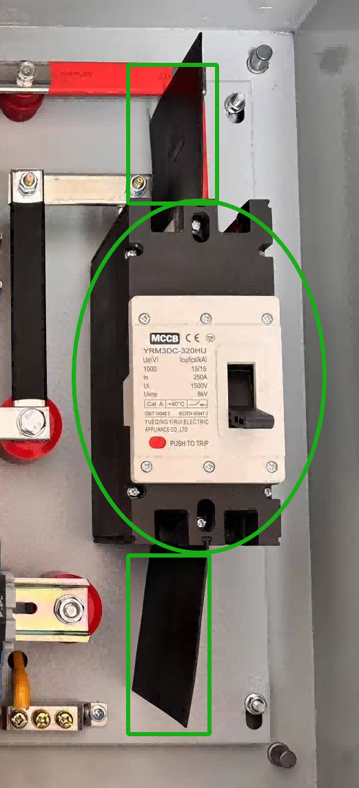 Existem duas coisas negras próximas ao disjuntor. Estas são placas de extinção de arco. A corrente direta tem uma característica de arco. Quando o fio vermelho e o fio preto são conectados, mas não circuitados curtos e estão próximos um do outro, podem ocorrer faíscas. Este é o fenômeno de arco. A função da placa de extinção do arco é impedir que isso aconteça.